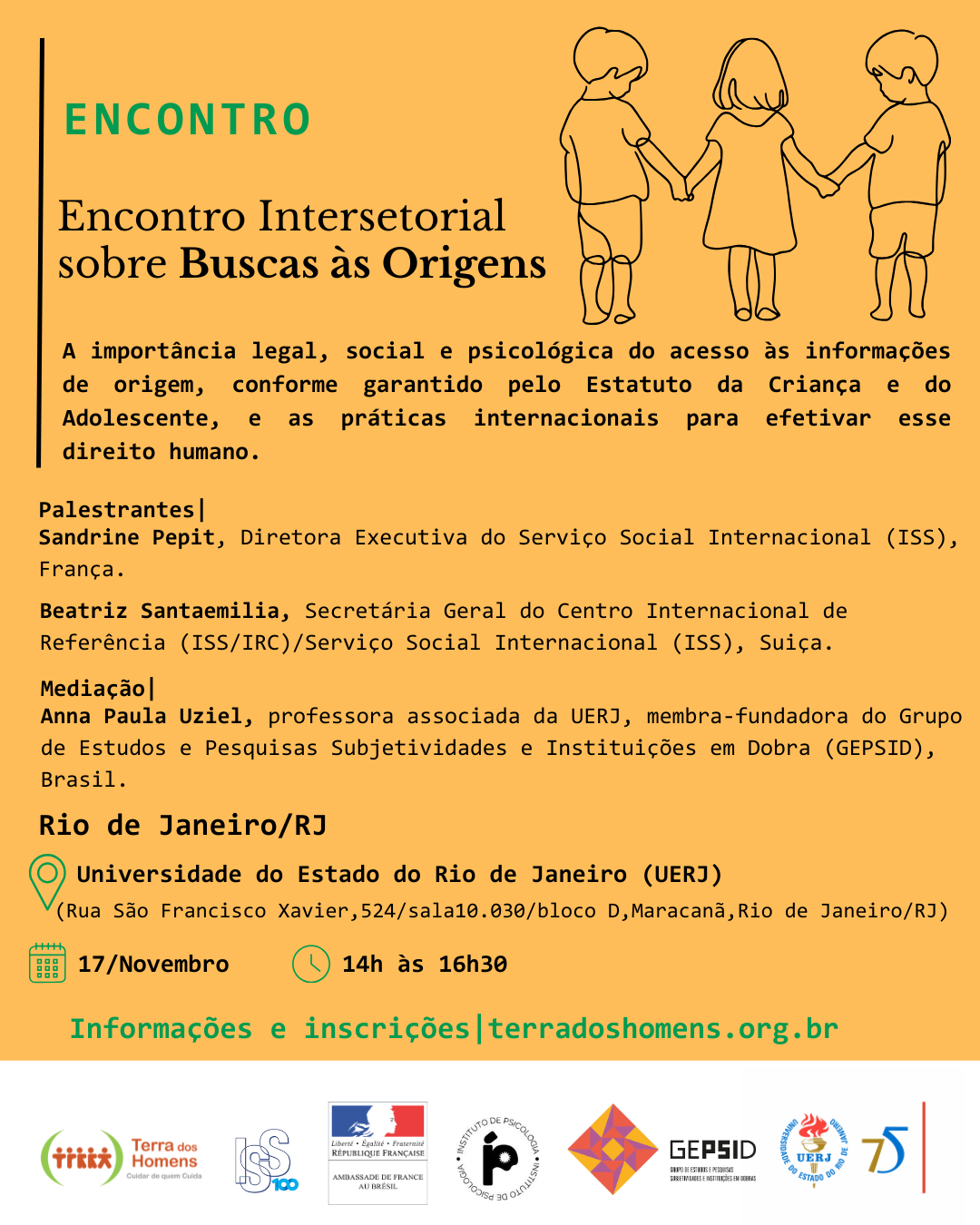A Associação Brasileira Terra dos Homens (ABTH), representante do Serviço Social Internacional (SSI) no Brasil, o Serviço Social Internacional da França conta com o apoio da Embaixada da França, no Brasil, em parceria com o Instituto de Psicologia (IP-UERJ), Grupo de Estudos e Pesquisas Subjetividades e Instituições em Dobras (GEPSID) da Universidade do Estado do Rio de Janeiro convidam os profissionais da psicologia, serviço social, adotados, famílias e a sociedade em geral para o Encontro Intersetorial sobre Buscas às Origens de grande relevância sobre o Direito à Origem Biológica que ocorrerá no dia 17 de novembro (segunda), das 14h às 16h30, na Universidade Estado do Rio de Janeiro, na sala 10.030, bloco D, Maracanã. Evento para convidados.