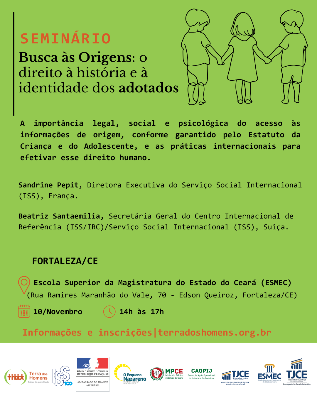 A Associação Brasileira Terra dos Homens (ABTH) - representante do Serviço Social Internacional (SSI), no Brasil com o apoio da Embaixada da França em Brasília e do Tribunal de Justiça do Ceará (TJCE) convidam a comunidade jurídica, profissionais do serviço social, adotados, famílias e a sociedade em geral para o Seminário Busca às Origens: o direito à história e à identidade dos adotados, próximo dia 10 de novembro, das 14h às 16h, na Escola Superior da Magistratura (ESMEC). VAGAS LIMITADAS - inscrições clique aqui